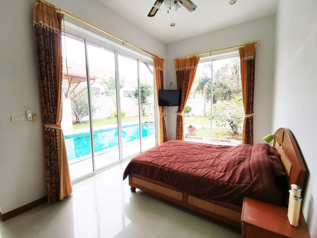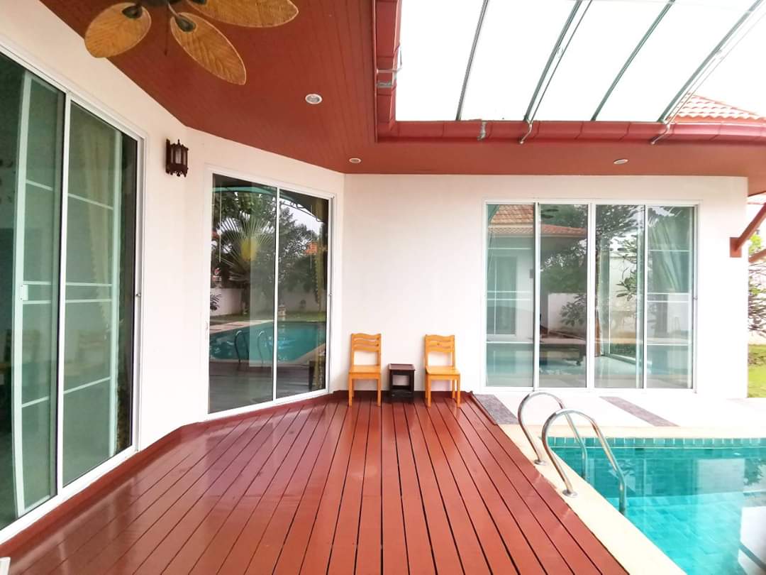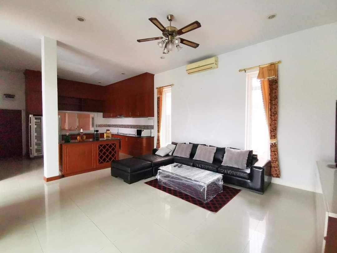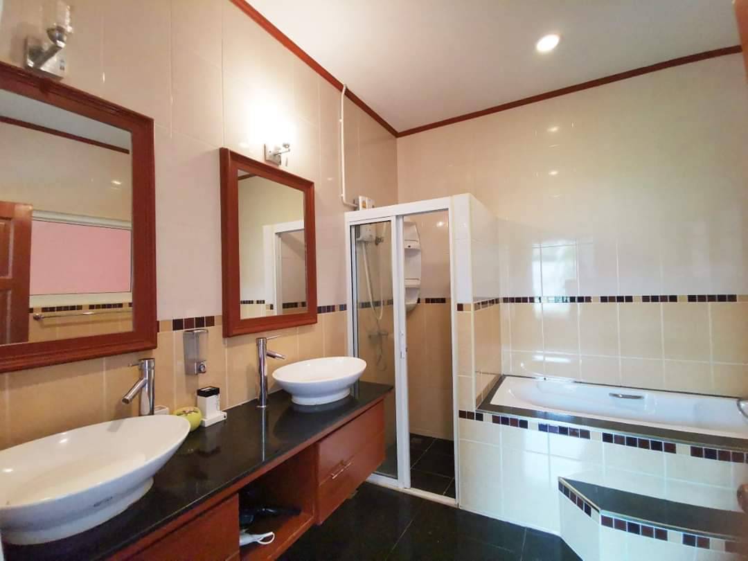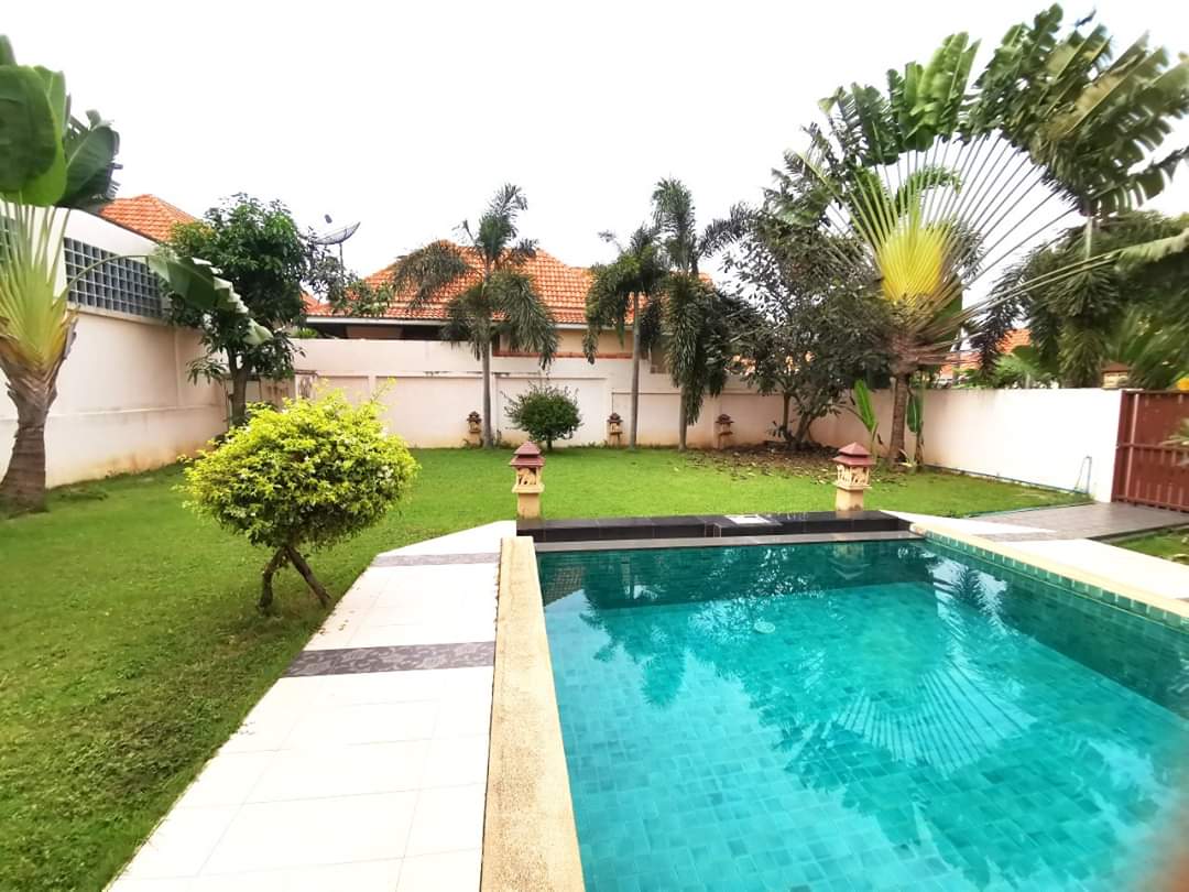 AD House Village located in the East Pattaya soi Khao Talo. This is 672 sq.m or 168 sq.w plot size and 270 sq.m of living space a one story house with 3 bedrooms 4 bathrooms fully furnished. European kitchen open living area cable TV and internet are available. Fully A/C private parking for 3 car and private swimming pool there is a good size of the pool and garden. 24/7 security guard. Located a shot distance to local market many convenience stores restaurant international school. 10 to 15 minute drive to Central Pattaya and 5 minute to Sukhumvit road . Under Thai name and transfer fee 50/50. For more information or viewing please contact us.